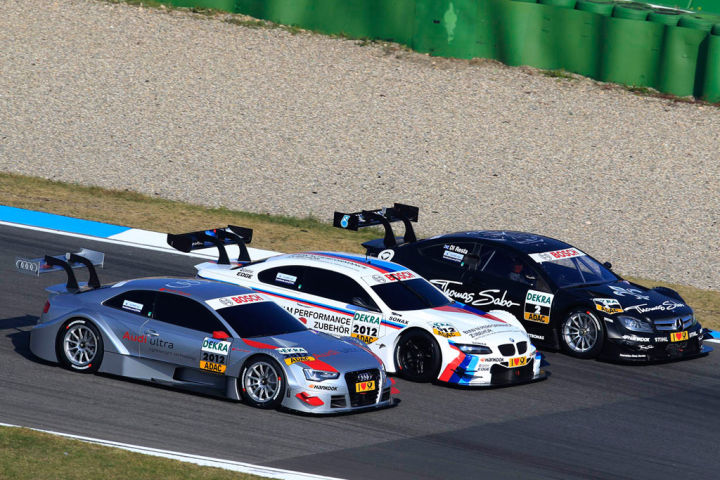 先來說DTM,我們看見的DTM,是一群奧迪RS5,寶馬M3,奔馳C級(jí)在賽場(chǎng)上跑,但是除了長得有點(diǎn)像外,這三輛賽車跟量產(chǎn)車一樣的地方就只剩下大燈了。這些賽車都是在規(guī)則的嚴(yán)格限制下專門打造的,專為一項(xiàng)比賽而生的賽車,所以有個(gè)說法稱DTM為帶殼子的F1。在比賽方面,DTM也比較接近方程式,拼走線,對(duì)碰撞的敏感度很高,而且容錯(cuò)率較低,沖出去很可能就回不來了。